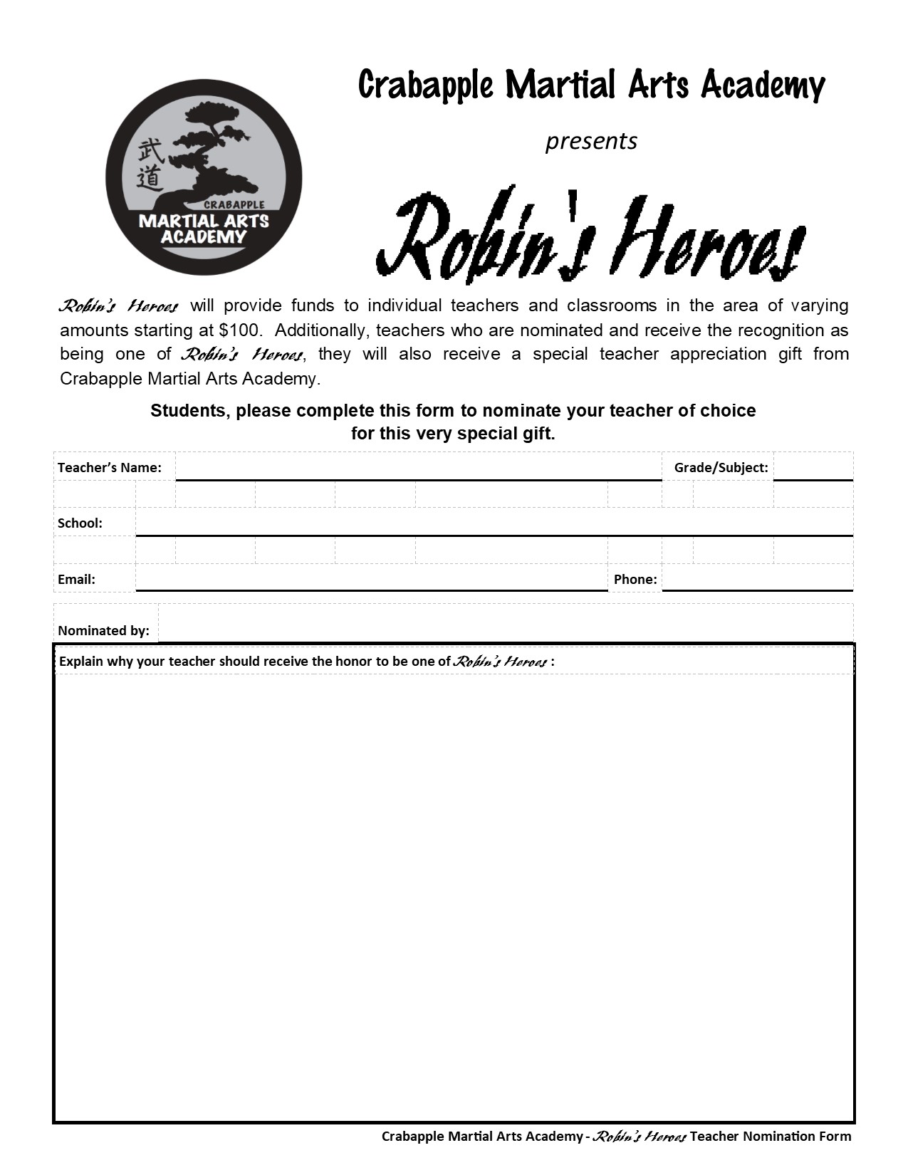 Crabapple Martial Arts Academy is accepting Classroom/Teacher nominations and will award its first classrooms starting in April. The Robin’s Heroes Initiative will continue as a monthly initiative moving forward. Students may nominate any teacher they choose by completing the Teacher nomination form and returning it to Crabapple Martial Arts Academy.